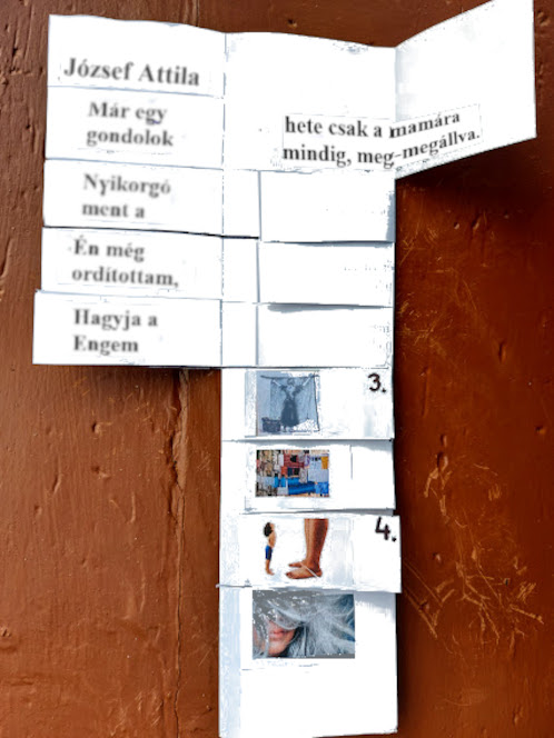 Készítése: Egy rajzlapot hosszanti irányban három részre hajtunk. A külső oldal első és második oldala üres, a belső oldal első egyharmadán a verssor egy-két szava, a harmadik egyharmadon a verssor többi része van. Végül, a lap első harmadát, és a harmadik harmadát vízszintesen bevágjuk, hogy külön-külön is lapozható legyen. 1 ábra: KIVÜL 2. ábra: BELÜL